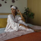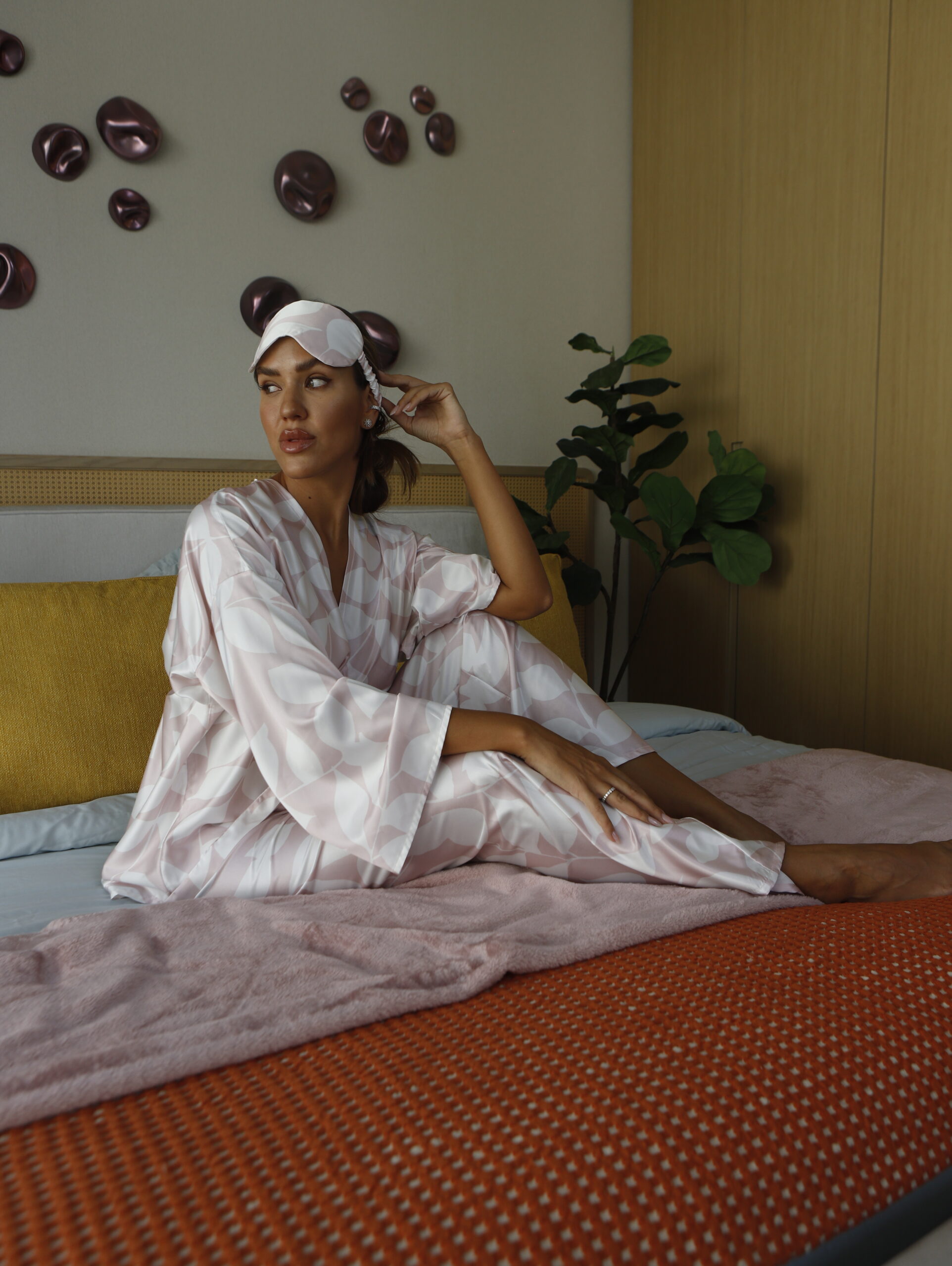 A powder-pink shade with an abstract print makes the look feminine and refined, creating the feeling of early morning light on the skin. This model pairs easily with both cozy home textures and accessories for city outfits.