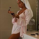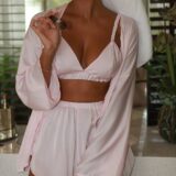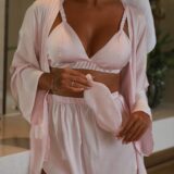 Made from premium smooth silk, the set feels weightless on the skin, offering natural breathability, cooling sensation, and a beautiful soft sheen. The pastel-pink tone enhances the feminine silhouette, making it perfect for slow mornings, self-care rituals, wellness retreats, or romantic evenings.